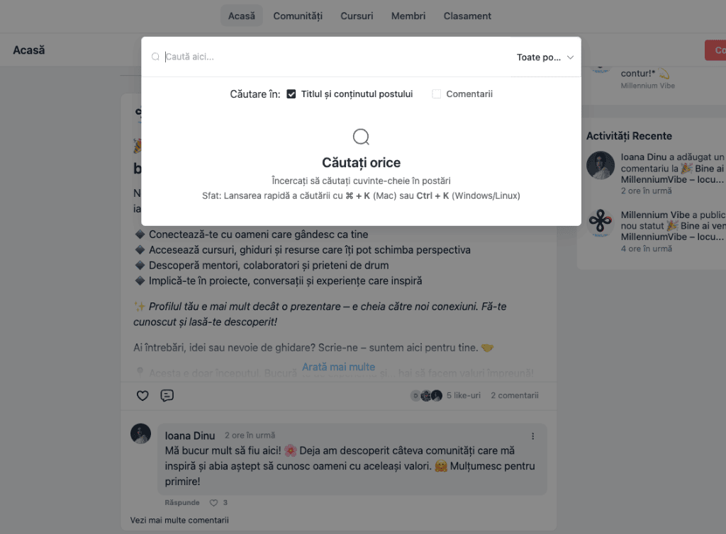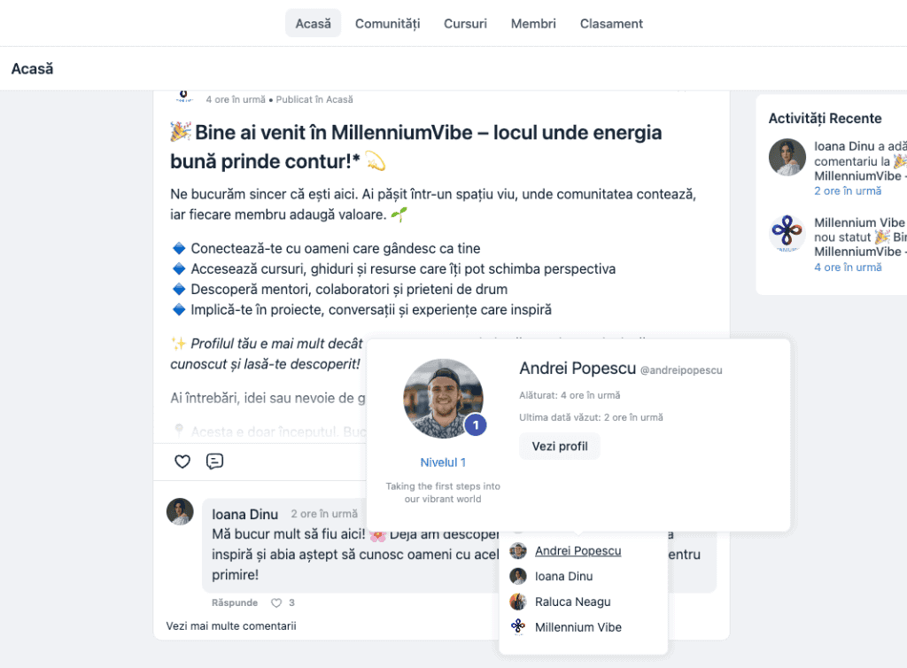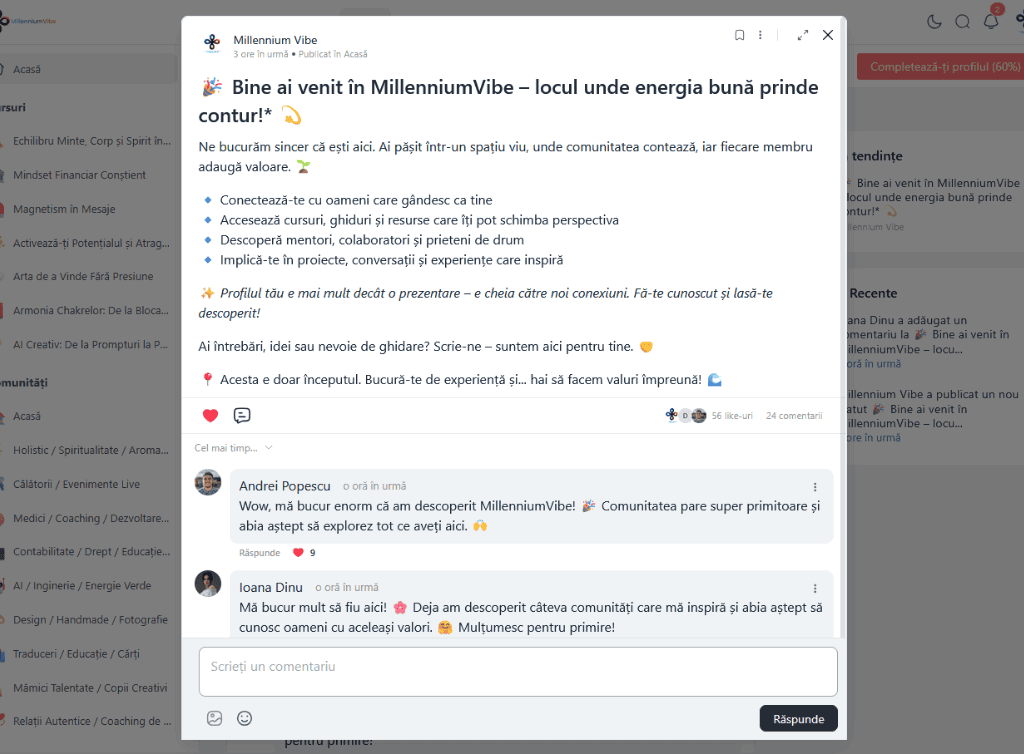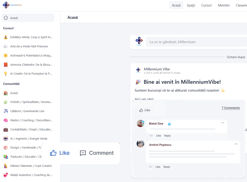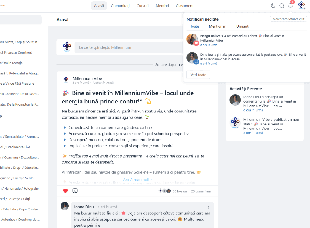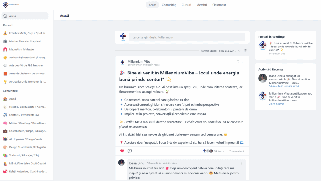 MilleniumVibe este o platformă digitală de comunități curate, conștiente și tematice, unde poți învăța, conecta, contribui și evolua — fără reclame, haos și algoritmi care te obosesc.