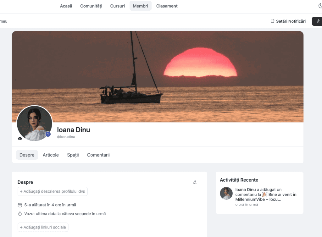 Ai un profil activ care reflectă evoluția ta: ce cursuri ai urmat, ce comunități frecventezi, ce contribuții ai. Poți primi badge-uri, recompense, acces VIP și bonusuri.